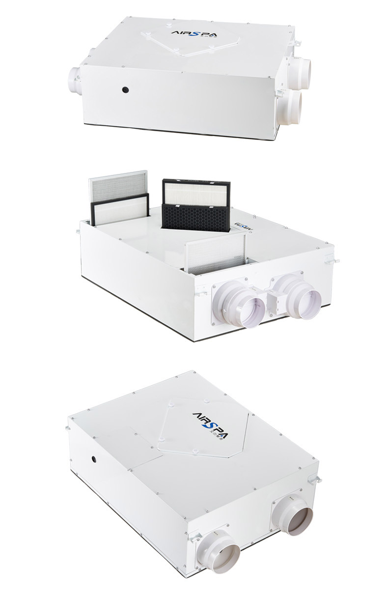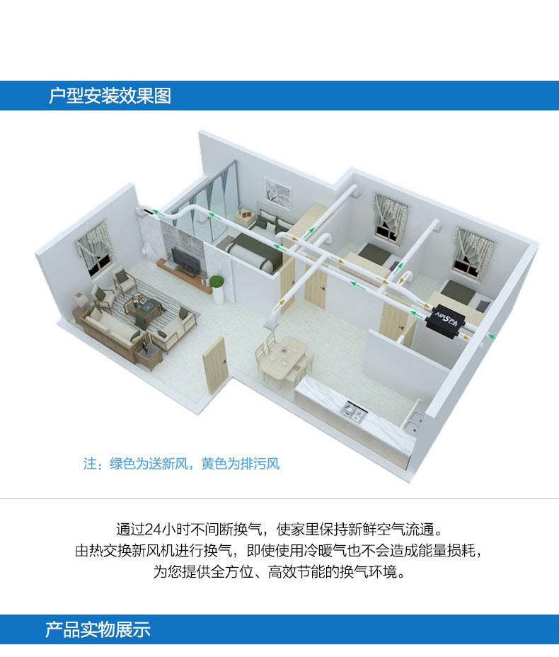 4、雙向流新風機:主機采用雙核動力設計,動力更強,體積更小